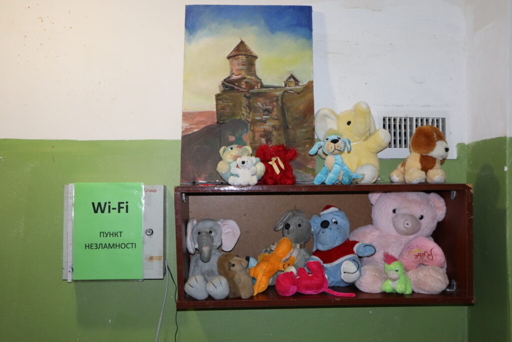 В укрытии есть игрушки, книги, раскраски и цветные карандаши. «Пункт незламності» также имеет в наличии пеленальный столик и запас подгузников. Здесь есть условия для комфортного пребывания родителей с детьми.