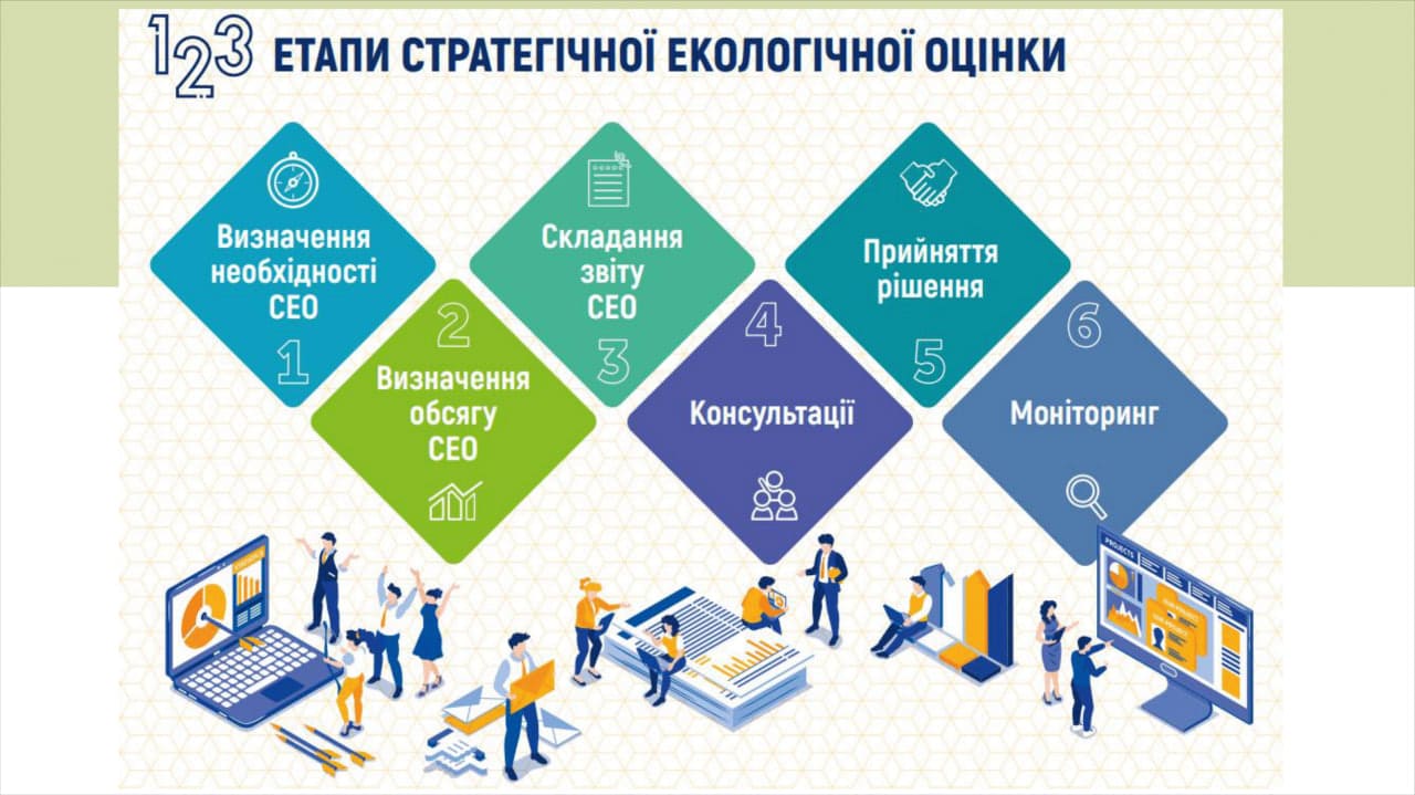 Этапы стратегической экологической оценки: определение необходимости СЭО, установление ее объема, подготовка отчета, проведение консультаций, принятие решения и дальнейший мониторинг.