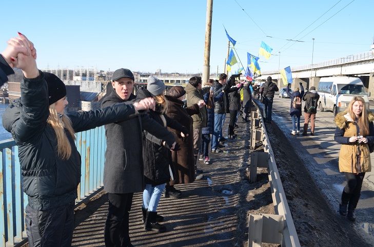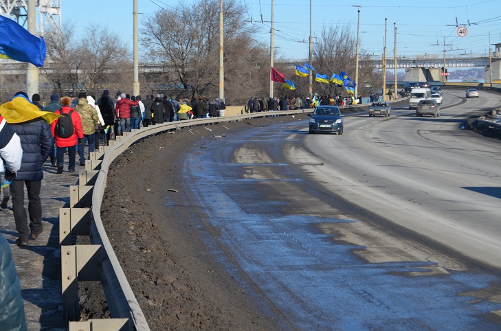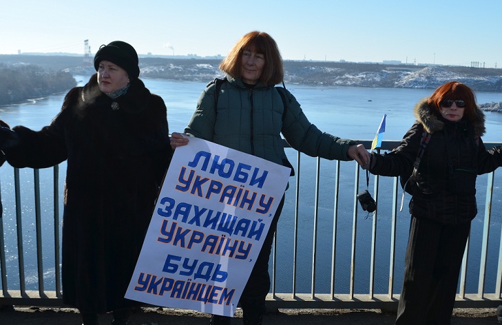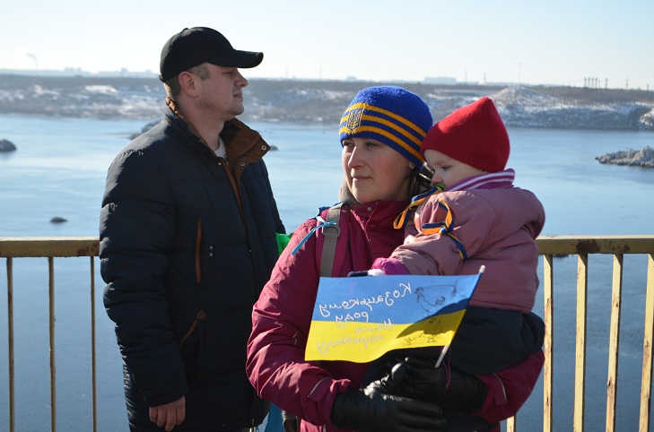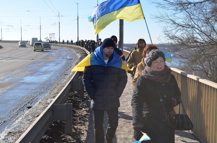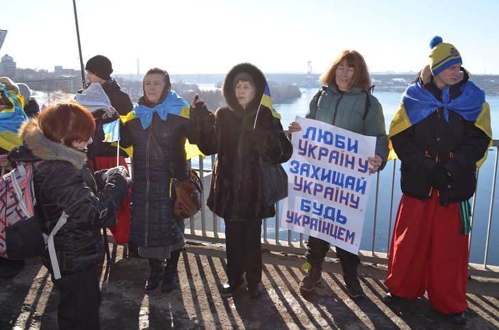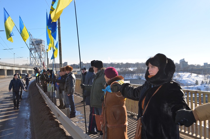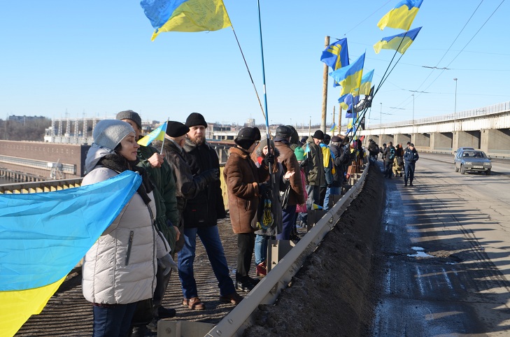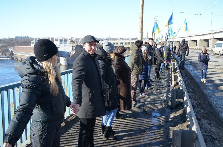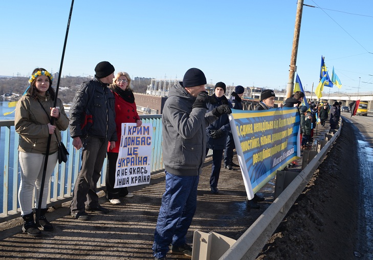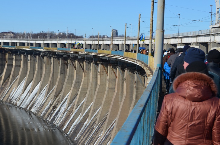 Запорожцы собрались с двух сторон Днепра и на середине плoтины и взялись за руки, выкрикивая традиционное: » Одна, єдина, соборна країна», «Слава Украине» и другие. Затем запорожцы совместно исполнили государственный гимн.