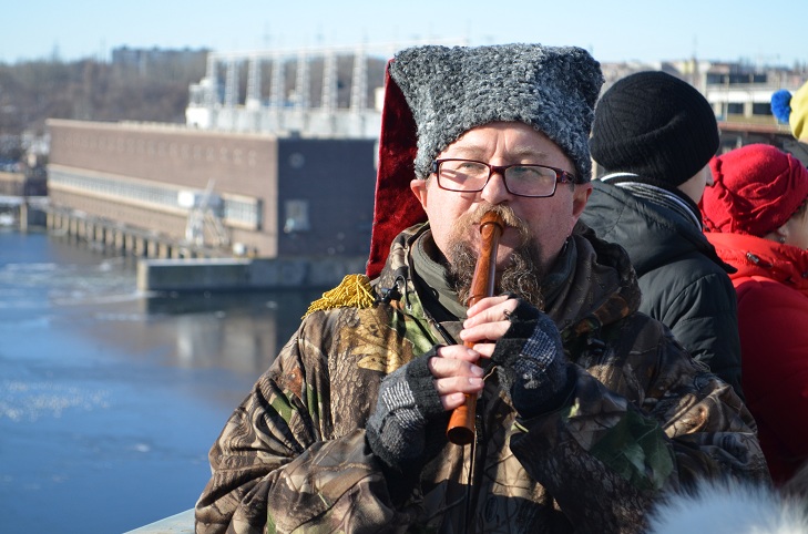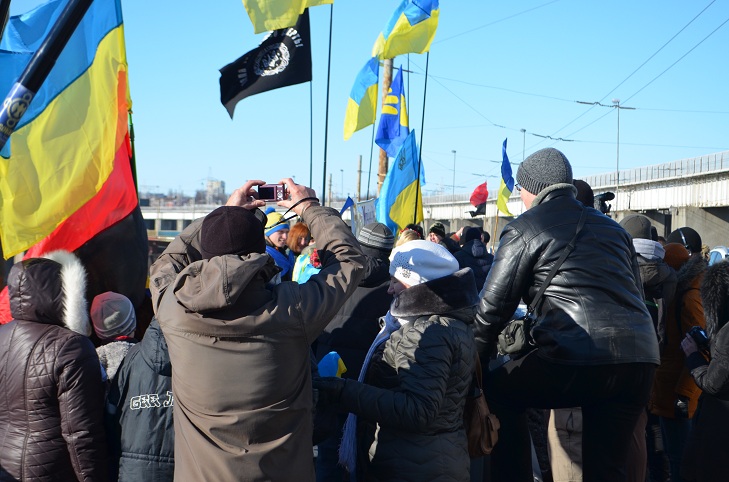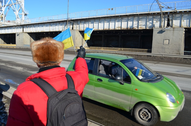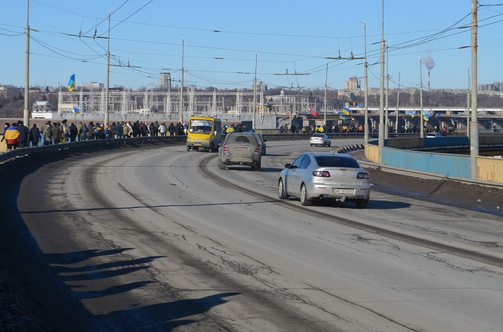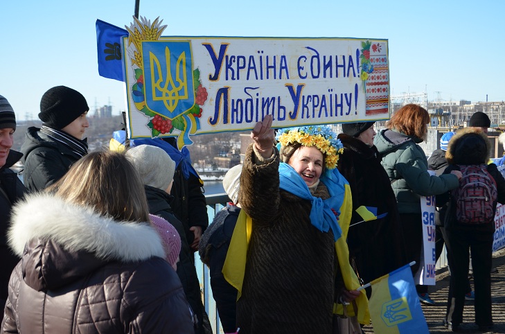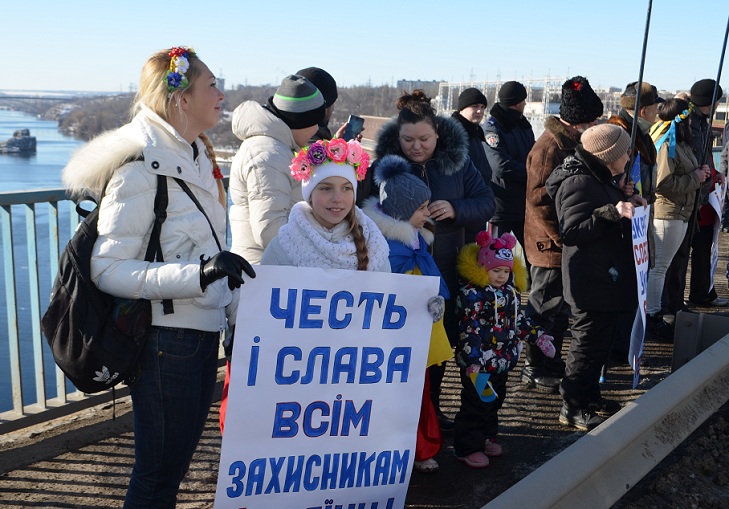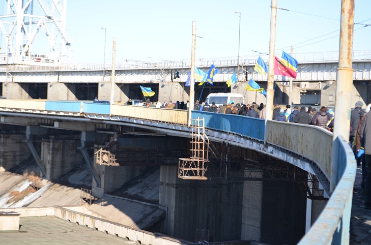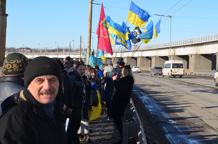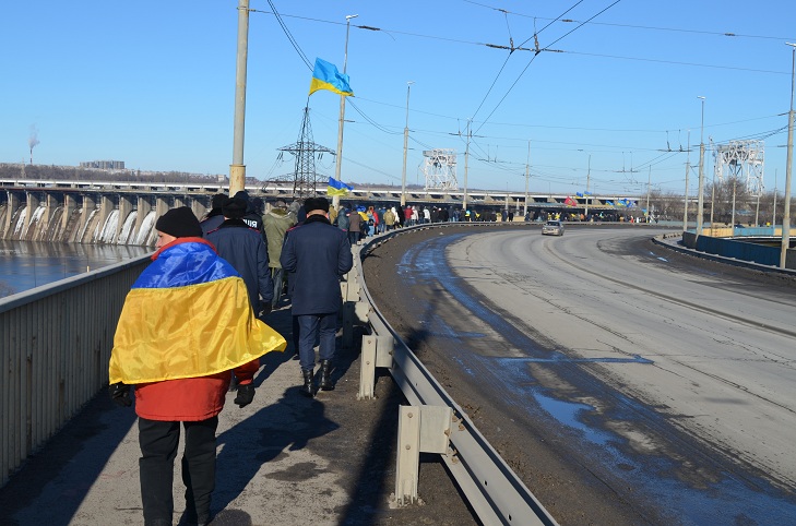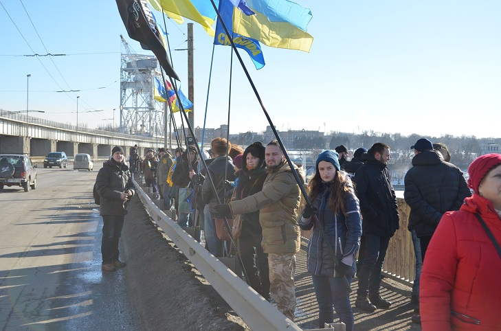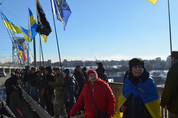 Запорожцы собрались с двух сторон Днепра и на середине плoтины и взялись за руки, выкрикивая традиционное: » Одна, єдина, соборна країна», «Слава Украине» и другие. Затем запорожцы совместно исполнили государственный гимн.