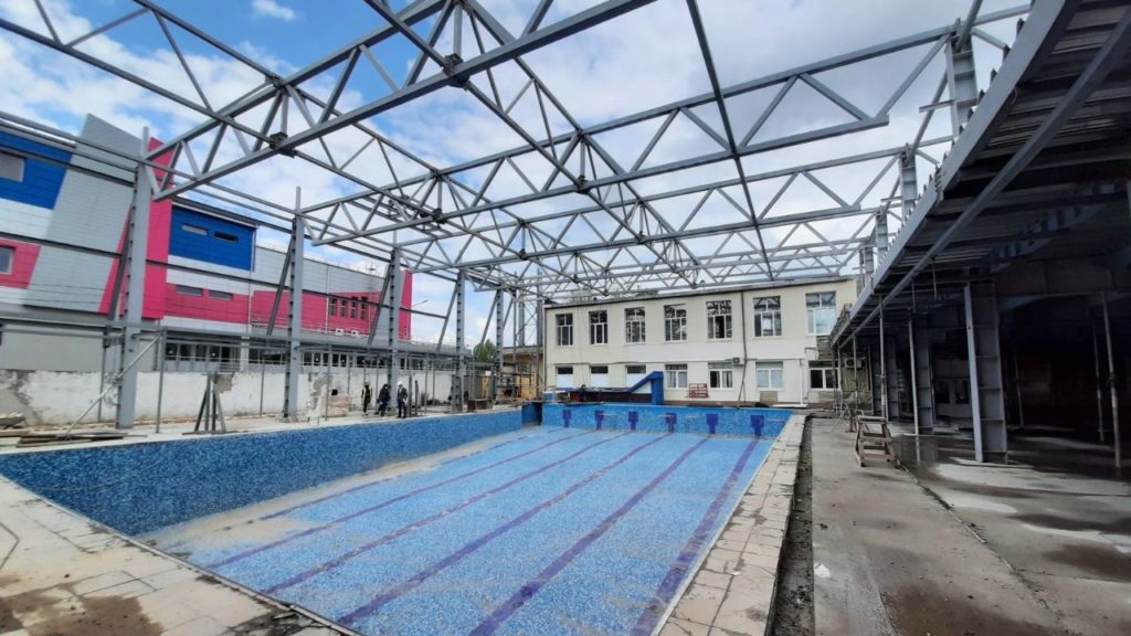 Строительство активно продолжается уже на протяжении шести месяцев. Подрядчик практически завершил монтаж металлического каркаса комплекса и уже закончен монтаж необходимых коммуникаций. По проекту строительство не коснется существующей чаши бассейна.