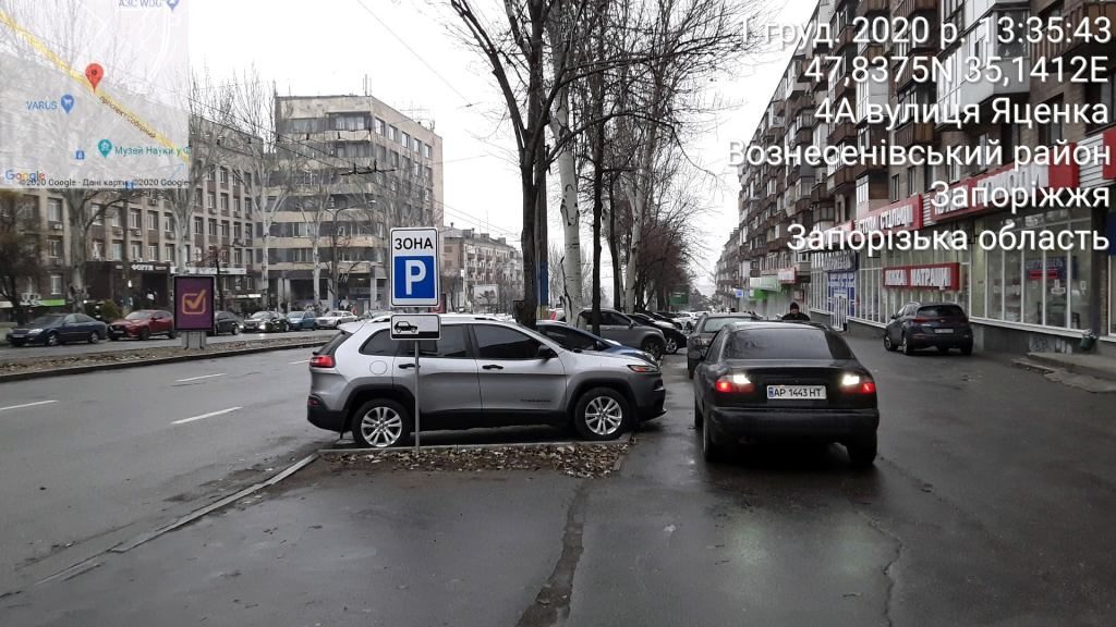 На участке проспекта Соборного, а именно возле дома №133 (здание «Укрпочты»), вместо части тротуара была оборудована парковка и установлены новые дорожные знаки, которыми предусмотрен способ постановки транспортного средства на стоянку.