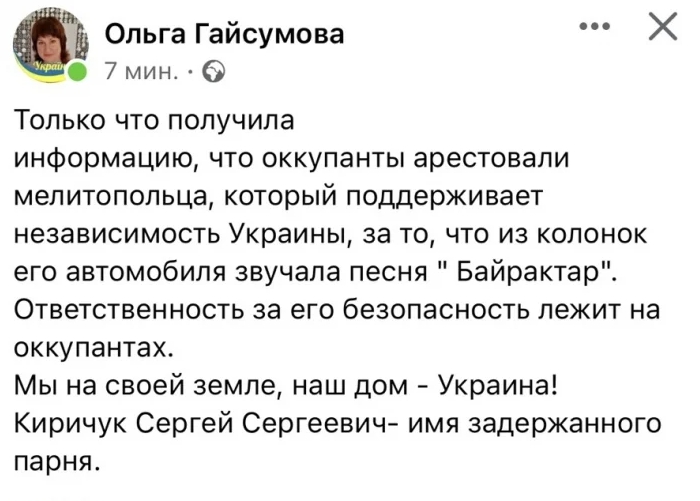 Вчера вечером, 9 марта, в Мелитополе выкрали отца семейства Сергея Сергеевича Киричук. По словам его жены, случилось это на улице Ивана Франко. Мужчина ехал в машине с женой и ребёнком. В машине громко звучала песня «Байрактар».