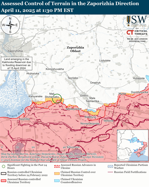 В частности, 11 апреля войска РФ провели наземные атаки северо-западнее Работино в районе Щербаков и Малых Щербаков Запорожской области, однако им не удалось продвинуться вперед.