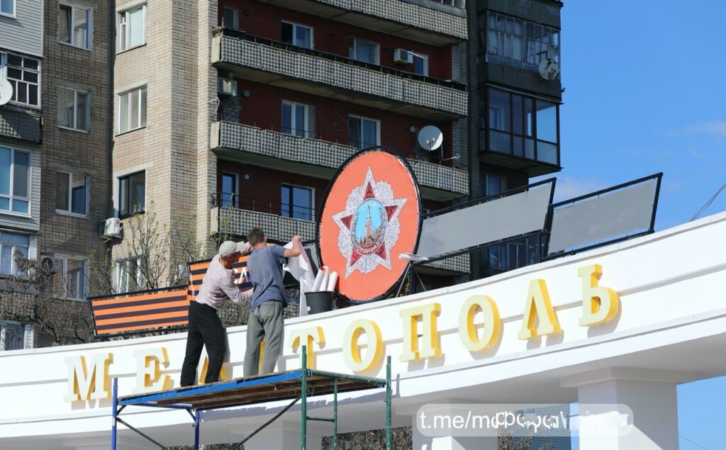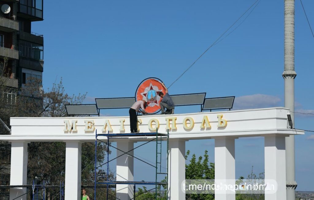 В Мелитополе оккупационные власти вернули на Арку Победы на центральной площади города демонтированные в рамках декоммунизации орден «Победа», георгиевскую ленту и надпись «Слава победителям».