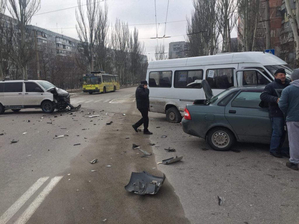 Как ранее сообщал «Первый Запорожский» около городской больницы №1 на конечной 14-го троллейбуса произошло столкновение между автомобилем Lada, маршруткой №40 и микроавтобусом Volkswagen Transporter.