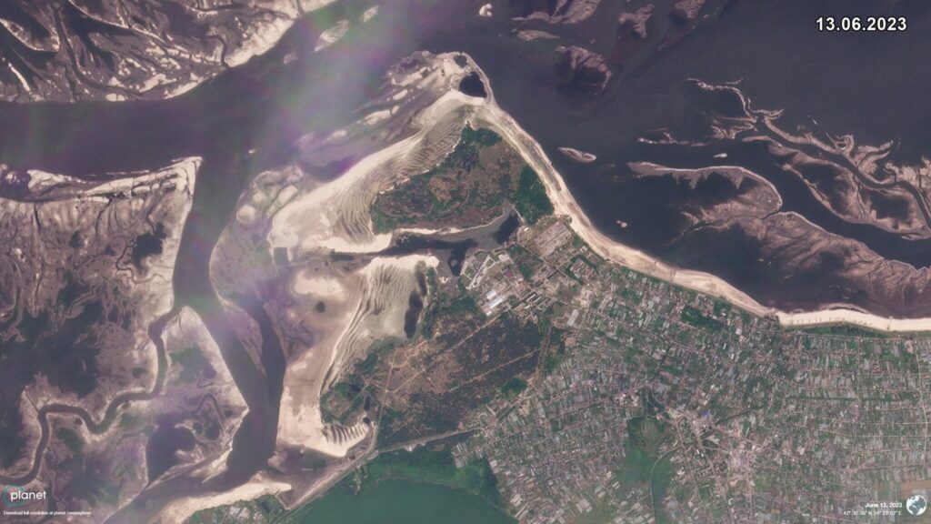 «После подрыва ГЭС по мере быстрого снижения уровня воды в Каховском водохранилище начинает обнажаться его дно вместе с гидрографией старинных озер и рек, когда-то составлявших часть легендарного Большого Луга. На снимках со спутника от 5-13 июня видно, насколько далеко отошла вода от берега в районе оккупированного рашистами города Каменка-Днепровская, – идет речь в сообщении. – Обнажилось не только предыдущее русло Днепра, но и русло воспетой в казацких песнях реки Конка, которая до затопления водохранилища сопровождала Днепр вдоль всей территории Большого Луга».