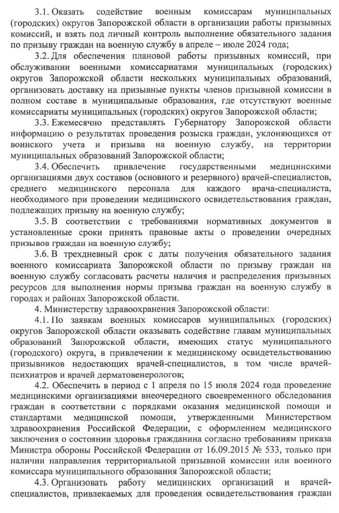 Сегодня, 24 апреля, «Бердянск 24» опубликовал распоряжение об организации на территории Запорожской области призыва граждан РФ на военную службу. Согласно этому «документу», Россия поставила перед коллаборантами план по привлечению, получивших российский документ, украинцев в ряды Вооруженных сил страны-агрессора.