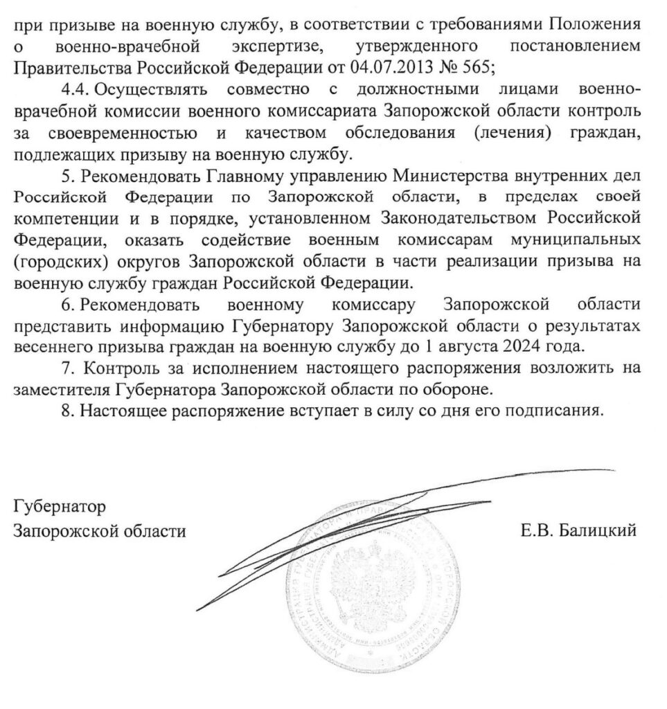 Также в «документе» отмечено, что ежемесячно Балицкому должны предоставлять информацию о проведении розыска уклонистов. До 1 августа оккупационный военный комиссар Запорожской области должен предоставить гауляйтеру информацию о результатах весеннего призыва.
