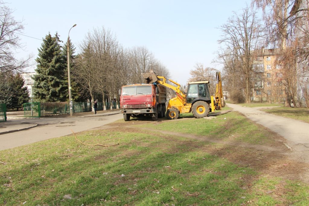 Шевченковский район города приводят в порядок — с придомовых территорий вывозят прошлогоднюю листву и ветки.