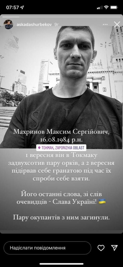 38-летний Максим Махринов 1 сентября совершил настоящий подвиг в Токмаке. Когда оккупанты ворвались к нему в квартиру и задержали, он решил, что не хочет быть пленников рашистов. При выходе из подъезда он подорвал гранату, забрав с собой несколько россиян.