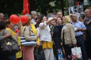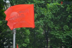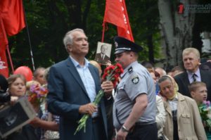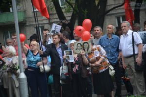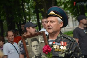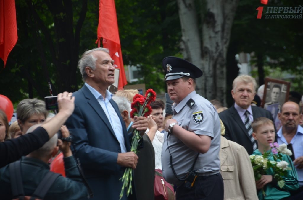 Возглавляют колону запорожские активисты с флагами Украины, которые поют гимн и скандируют «фашизм не пройдет». Сзади передвигаются участники шествия с красными флагами «Полк Победы 1941-45», пенсионеры с фотографиями своих родственников-фронтовиков.