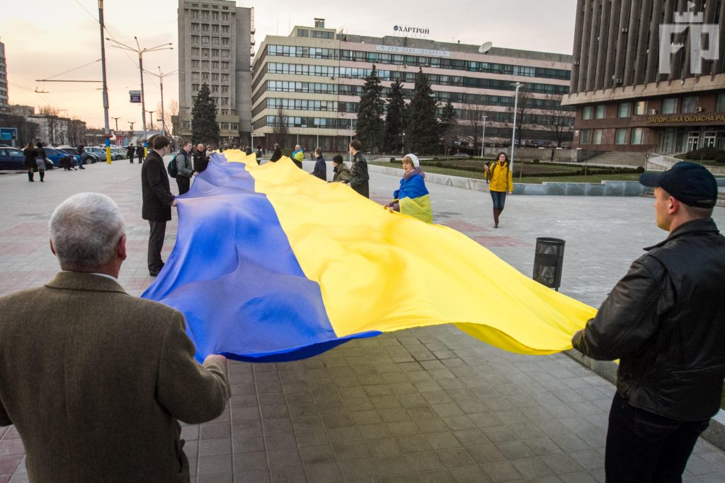 Вчера, 17 марта, в честь 100-летия со дня начала Украинской революции 1917-1921 годов активисты растянули в центре Запорожья огромный флаг Украины.