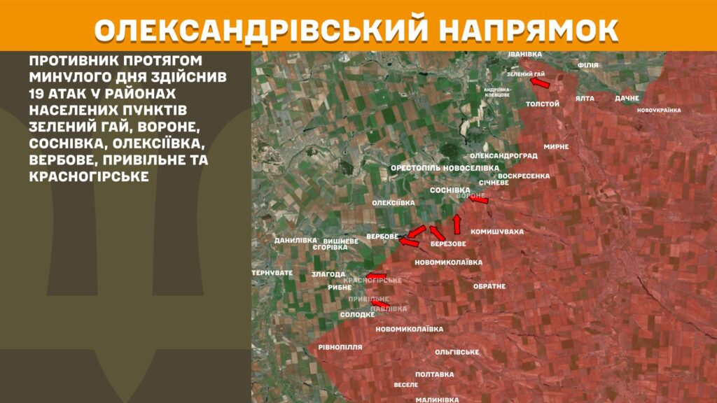 На Александровском направлении противник в течение прошлого дня совершил 19 атак в районах населенных пунктов Зеленый Гай, Вороне, Сосновка, Алексеевка, Вербовое, Привольное и Красногорское.