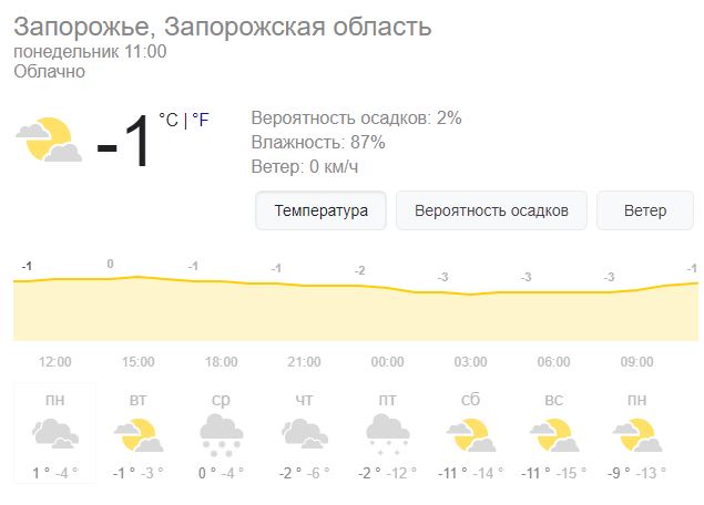 Согласно сайтами, которые показывают прогноз погоды, запорожцам следует готовиться к морозам.