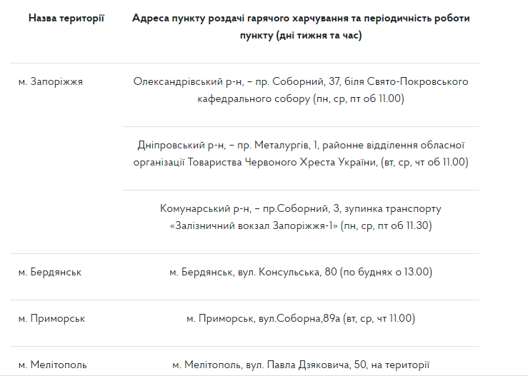 Горячее питание предоставляется в городах Запорожье, Бердянск, Приморск, Мелитополь, Энергодар и в Вольнянском, Васильевском районах.