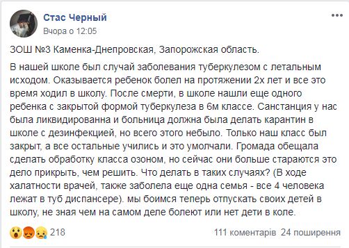 Родители учеников ООШ №3 города Каменка-Днепровская бьют тревогу, ведь от туберкулеза умер школьник, два года посещал занятия.