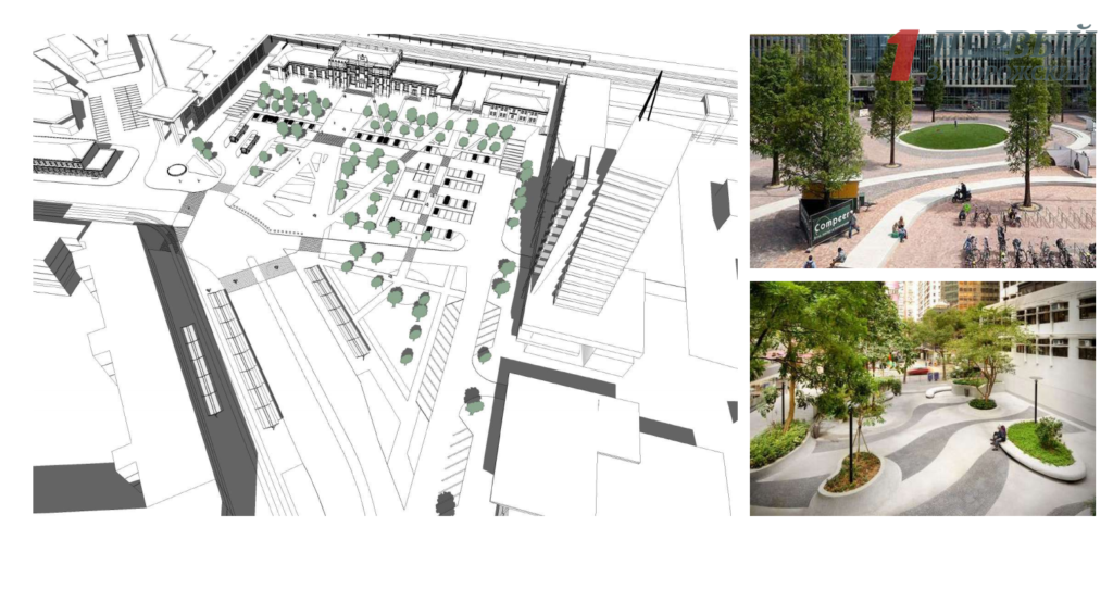 Примечательно, что перед самим вокзалом будет освобождена центральная ось, которая будет вести к зелёной зоне с комфортными лавочками. Здесь будет около 70 деревьев и фонтаны.