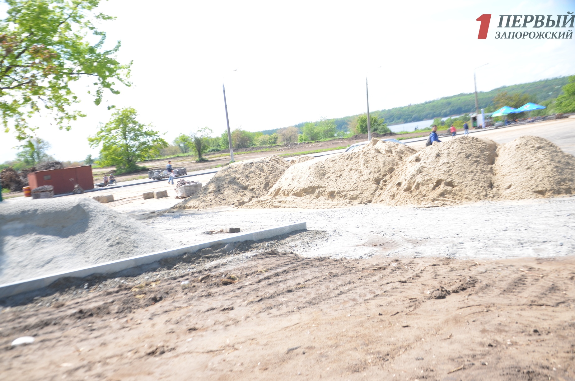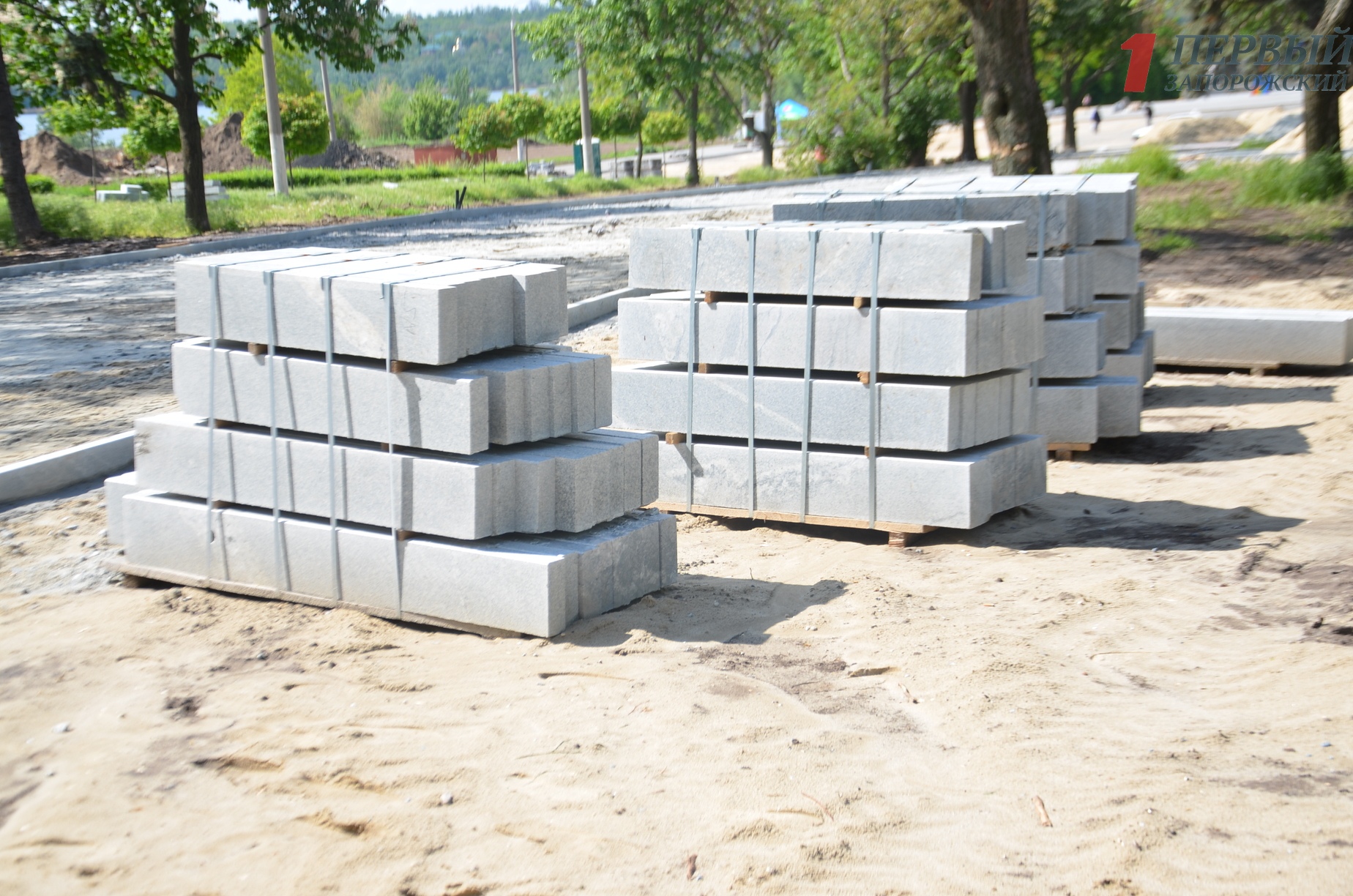 На самой пешеходной части сейчас не проводят никаких работ. Здесь вдоль аллеи расположены насыпи с песком и валяется бордюрные камни, которые еще только предстоит установить.