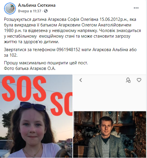 Мать девочки Альбина Сюткина сообщила у себя на странице в Фейсбук, что ее дочь Агаркова София была похищена отцом Агарковым Олегом.
