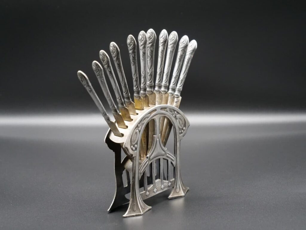 Подставка в виде арки украшена стилизованным растительным орнаментом в верхней части и геометрическим в стиле модерн в центральной части. Рукоятки ножей украшены растительным орнаментом в стиле псевдорококо.