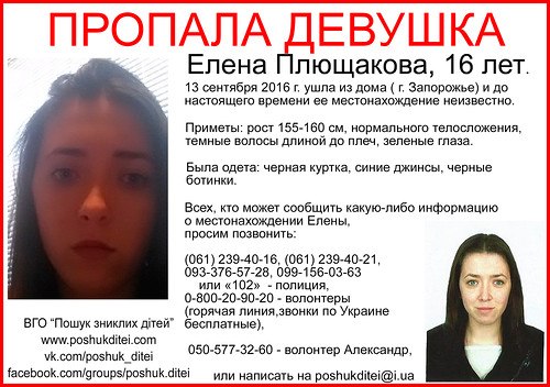 13 сентября этого года в Запорожье пропала 16-летняя Елена Плющакова. Девушка ушла из дома, но до этого времени так и не вернулась.