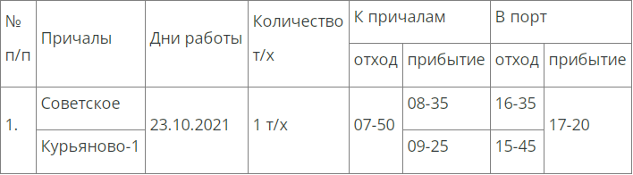 Катер будет курсировать по направлению «Советское», «Курьяново-1» по следующему расписанию движения:
