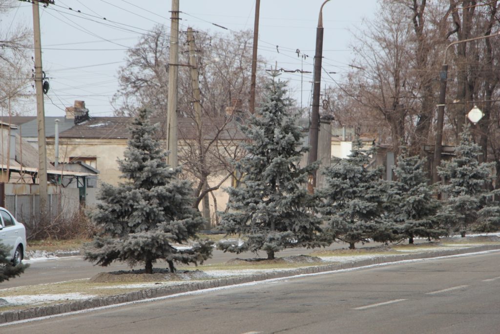 Сегодня стали белыми ели и сосны в Заводском районе по улице Демократической. Сотрудники КРСП «Зеленстрой» обработали их специальным раствором. Таким образом коммунальщики защищают хвойные деревья от вандалов. Всего же по району обработают порядка 100 деревьев. Визуально кажется, что на веточках деревьев лежит белый иней. Если же такую ель или сосну, срубленную в городе, занести в дом, то головная боль и недомогания правонарушителю обеспечены.