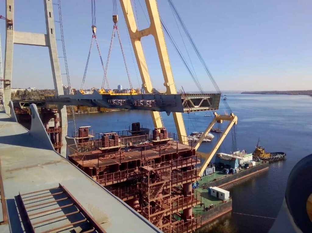Процес монтажа секций низовой части моста аналогичен процессу, который проходил по верховой части. Напомним, 28 июля, «Захарий» установил последнюю секцию верховой ветви вантового моста с левого берега Запорожья на Хортицу.