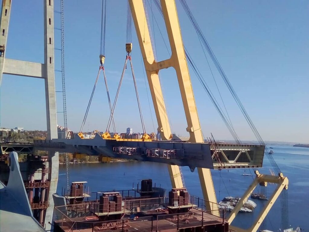 Вчера утром кран «Захарий» транспортировал от выкаточного пирса в Кривой бухте уже третью секцию пролетного строения. В течение дня третий сегмент пролетного строения запорожского вантового моста был установлен.