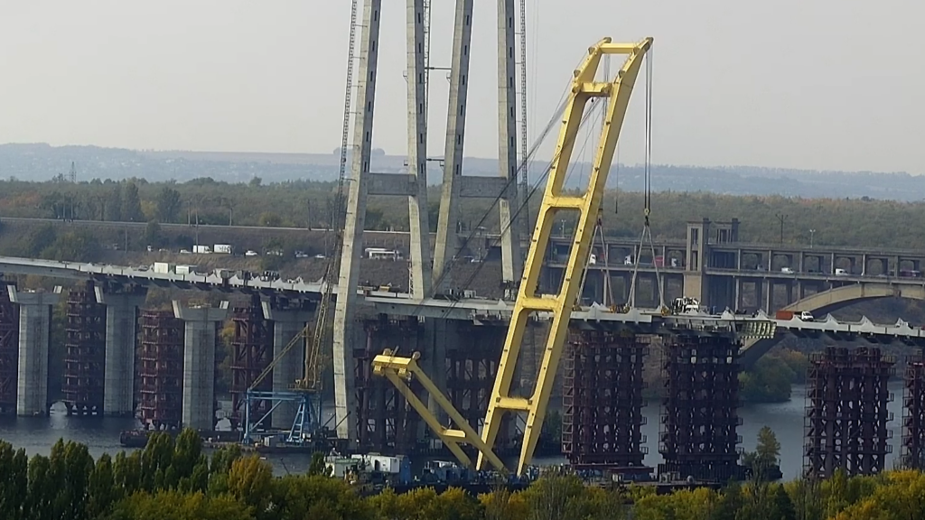 Процес монтажа секций низовой части моста аналогичен процессу, который проходил по верховой части. Напомним, 28 июля, «Захарий» установил последнюю секцию верховой ветви вантового моста с левого берега Запорожья на Хортицу.