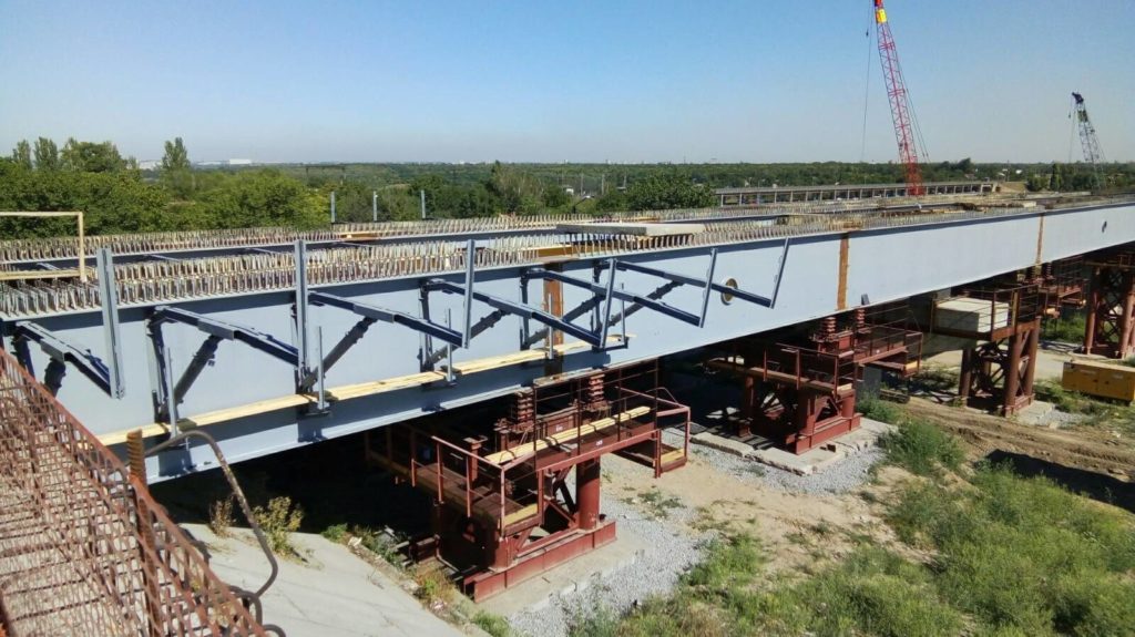 Подрядная организация заканчивает монтаж металлических балок пролетного строения Сооружения №3 (эстакада на подходах к мосту через Старый Днепр). На сегодня уже смонтировано 26 из 30 необходимых блоков.