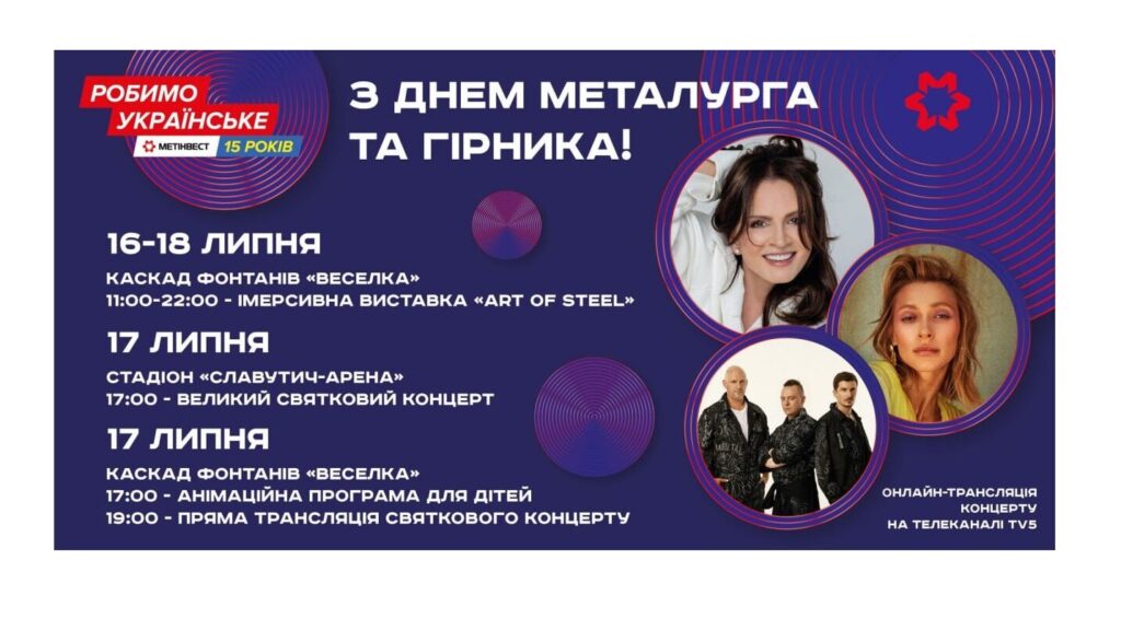 Компания Метинвест дарит праздник не только своим работникам, а и жителям всего города. На каскаде фонтанов «Радуга» жителей и гостей Запорожья ждут выступления артистов, анимационная программа для детей, а также трансляция главного концерта со стадиона «Славутич-Арена», которая начнется в 19:00.