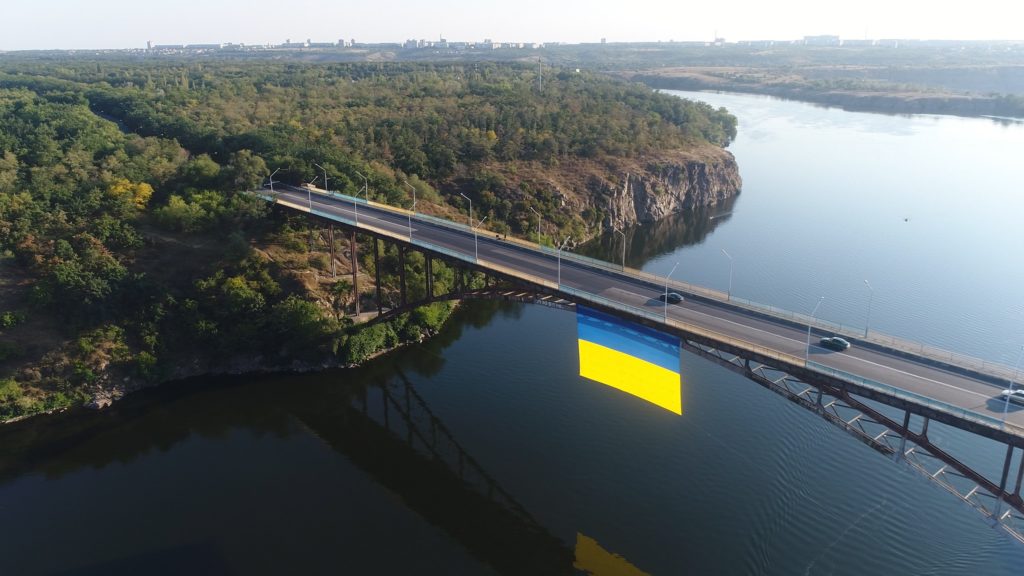 В Запорожье ко Дню государственного флага и Дню независимости Украины на Арочном мосту вывесили над Днепром государственный флаг площадью 400 квадратных метров – самый большой национальный флаг во всей области.