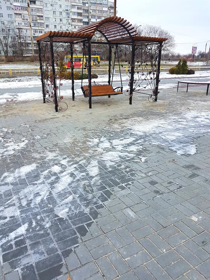 В Запорожье возле ДК "Хортицкий" установили лавочку-качели с кованой беседкой, – ФОТО