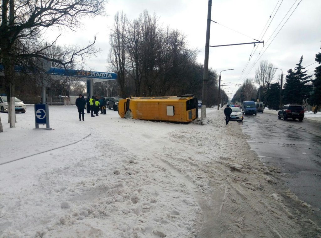 Как рассказали в пресс-службе патрульной полиции города, водитель пояснил, что наехал на заснеженный бордюр, которого не видел, в результате чего маршрутку занесло юзом и она перевернулась.