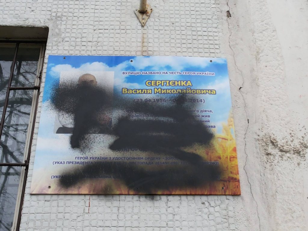 Неизвестные лица закрасили черной краской мемориальную информационную доску памяти Героя Небесной сотни Василия Сергиенко. Об этом сообщают пользователи соцсетей.