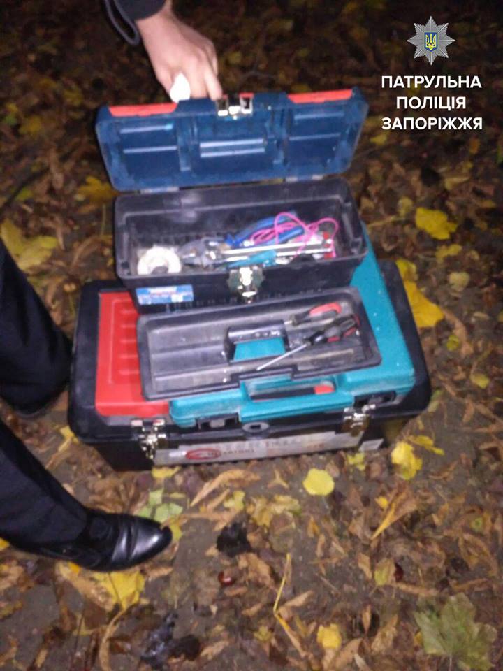 Во время поверхностной проверки у мужчины обнаружили черную сумку, в которой находились инструменты: отмычки, ключи, опылители, ножи устройство на считывание сигнала сигнализации в автомобилях. Также неподалеку от мужчины находились три ящика, в которых были строительные инструменты.