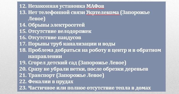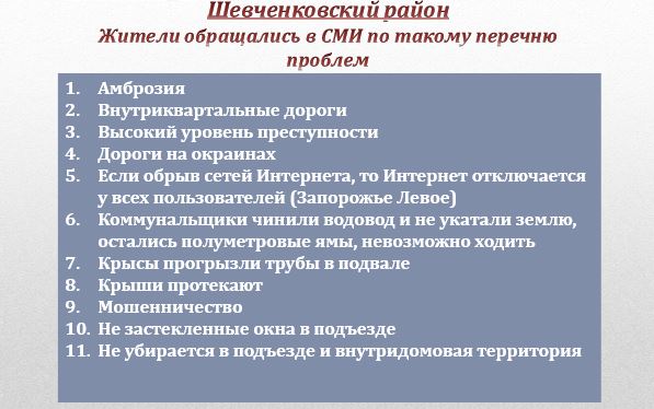 Два района Запорожья, а именно Хортицкий и Шевченковский, стали лидерами по количеству существующих проблем. Жители недовольны разбитыми дорогами, протеканием крыш, отсутствием фонарей и мусорных баков, мошенничеством, зарослями амброзии.