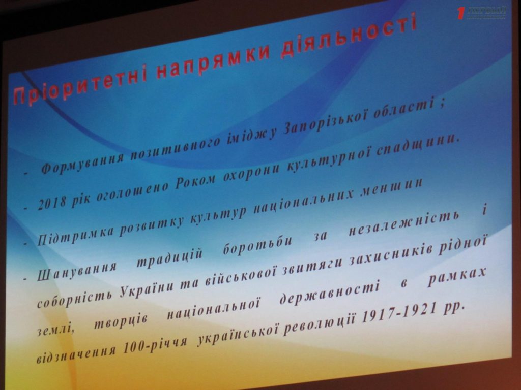 В Запорожье 2018 год объявлен Годом охраны культурного наследия. Сохранение и более эффективное использование памятников прошлого в воспитании будущих поколений может поспособствовать подъему национального сознания и достоинства. Отметим, что важным направлением работы областной власти остается поддержка развития культур национальных меньшинств и создание условий для сохранения языковой и этнокультурной самобытности наций и народностей, проживающих в регионе.