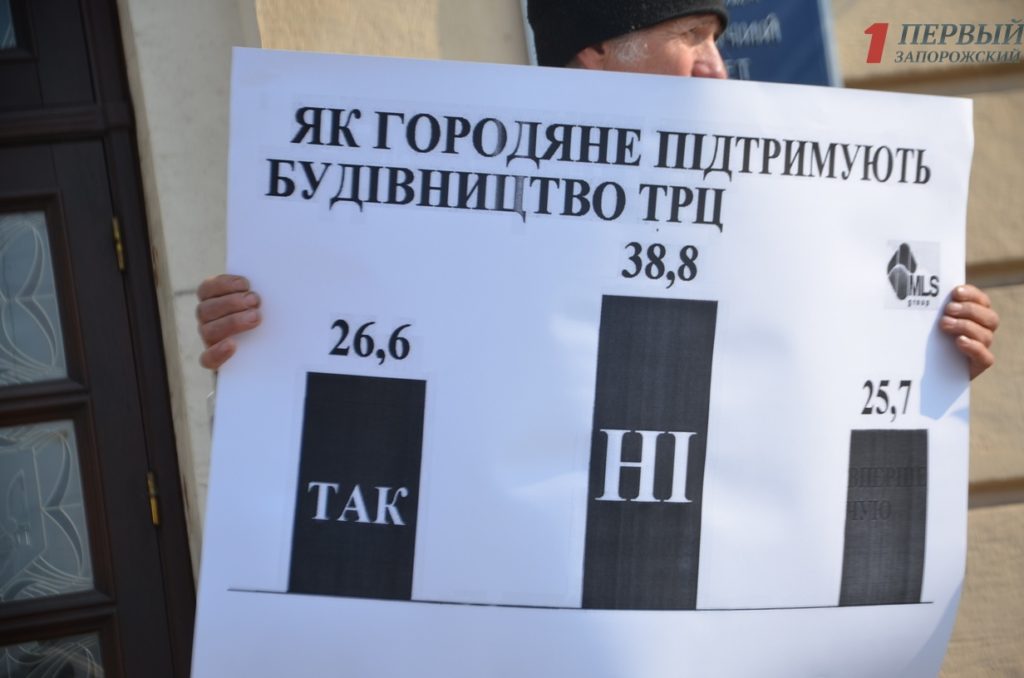 Участники митинга, ссылаясь на социологические исследования утверждают, что идею строительства торгового центра частным инвестором Владимиром Кальцевым поддерживают 26,6% запорожцев, в то время как 38% выступают против, а еще 25,7 % не определились со своим отношением.