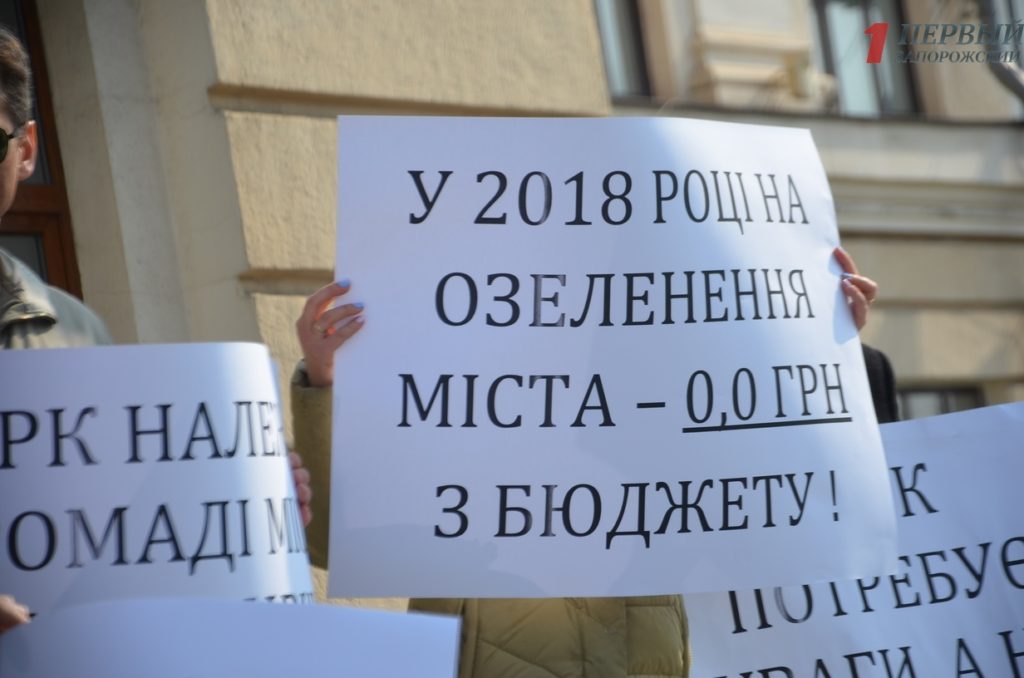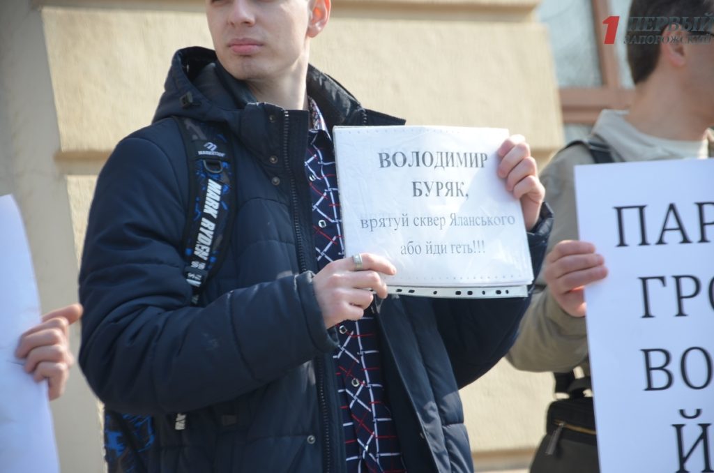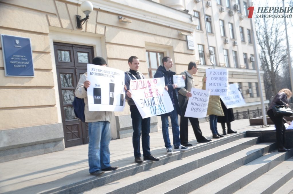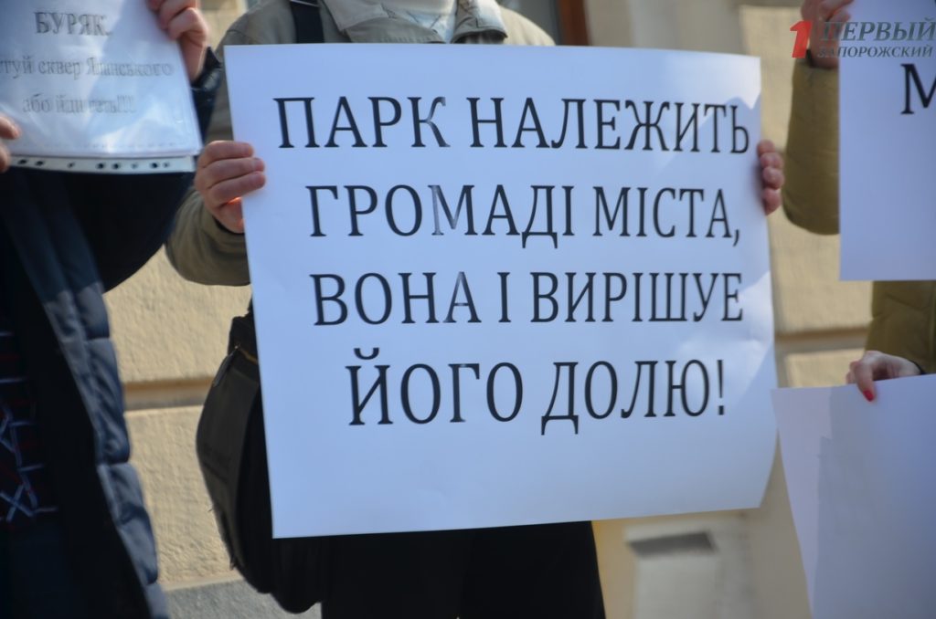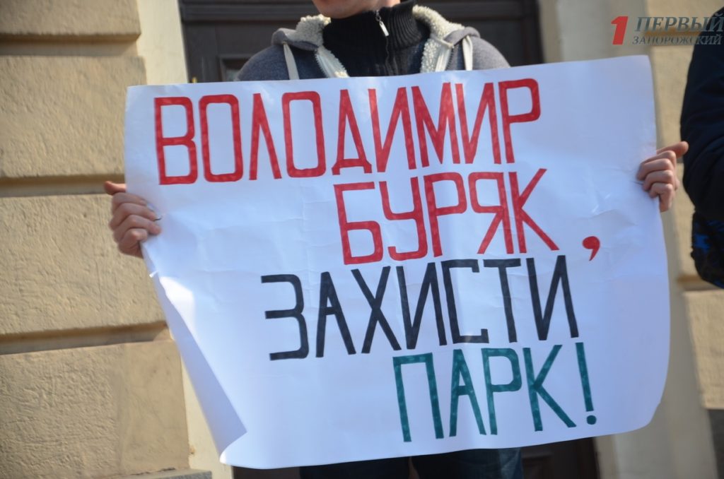 На акцию вышли с десяток активистов с плакатами с просьбами защитить парк: «Парки ніколи не вбивають», «Володимир Буряк захисти парк» и «Парк належить громаді міста, вона і вирішує його долю».