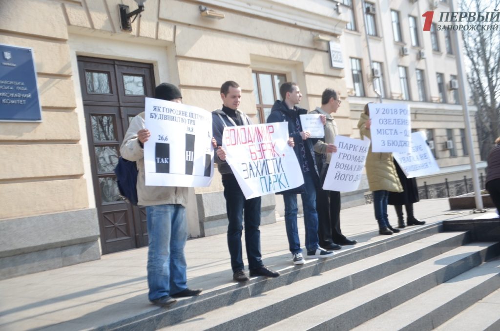 Сегодня, 28 марта, перед Запорожским городским советом прошла малочисленная акция против застройки сквера имени Яланского (напротив универмага «Украина»).