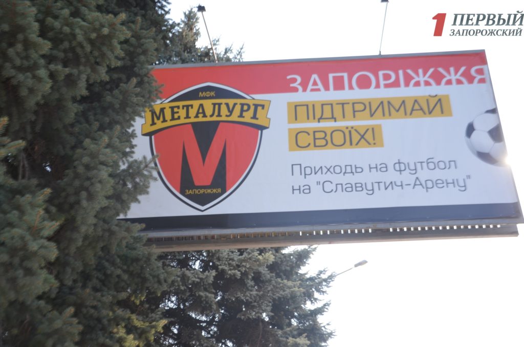 Рекламный щит содержит логотип футбольного клуба и надпись «Запоріжжя підтримай своїх! Приходь на футбол на Славутич-Арену».