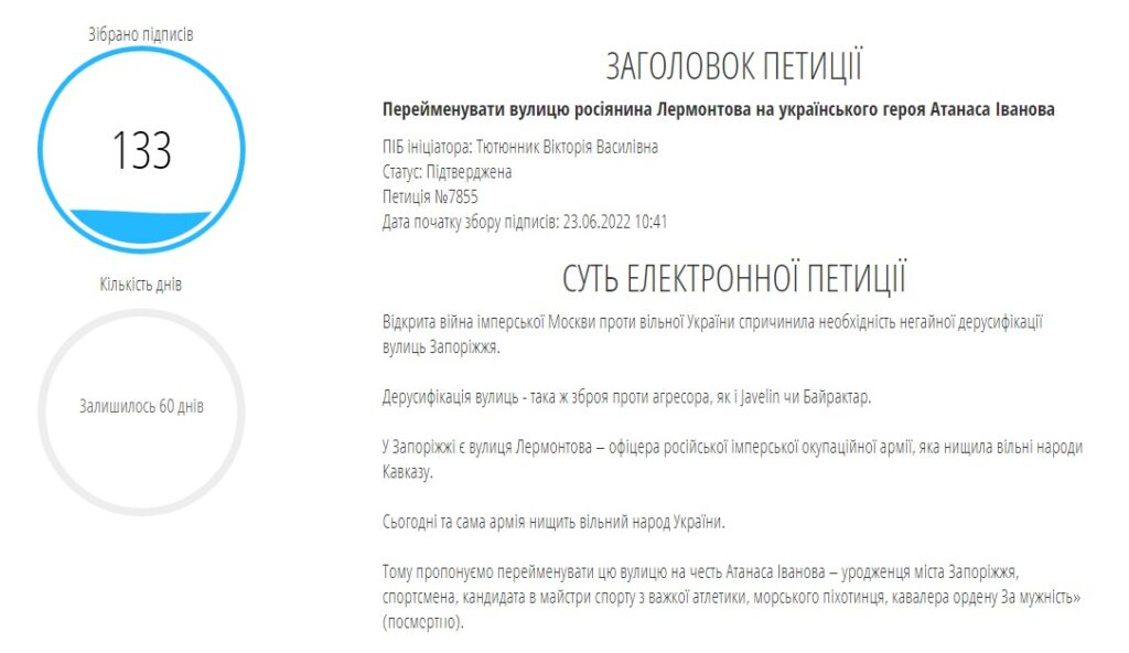 «В Запорожье есть улица Лермонтова – офицера российской имперской оккупационной армии, которая уничтожала свободные народы Кавказа. Сегодня та же армия уничтожает свободный народ Украины. Поэтому предлагаем переименовать эту улицу в честь Атанаса Иванова – уроженца города Запорожья», – говорится в сообщении петиции.
