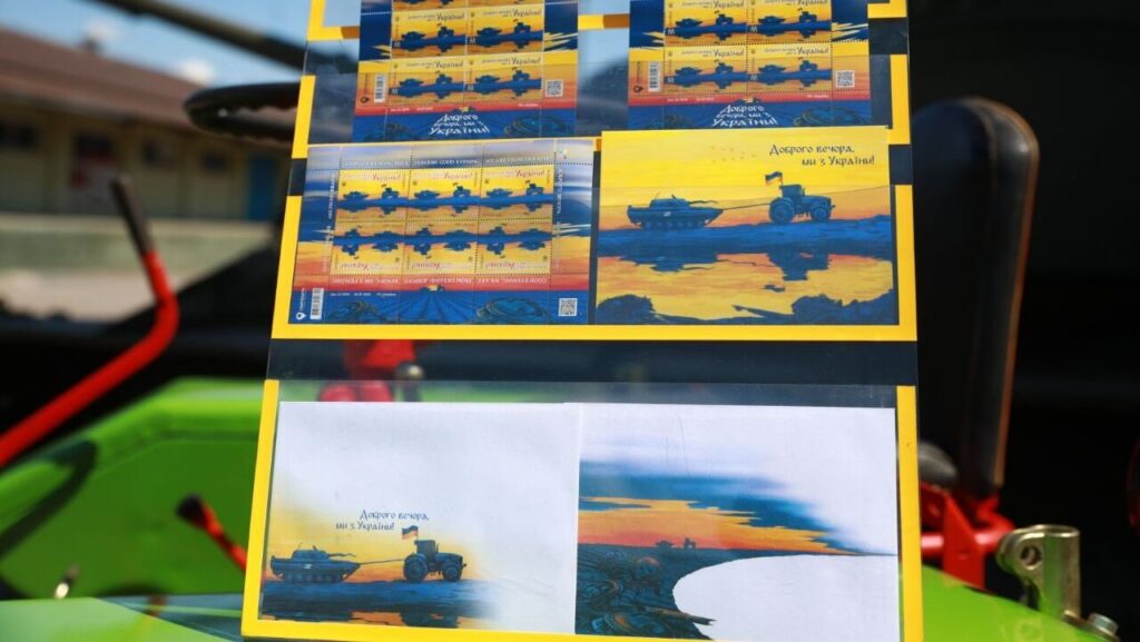 На марке изображены реальные события в Николаевской области – украинский трактор тянет брошенный российский танк.