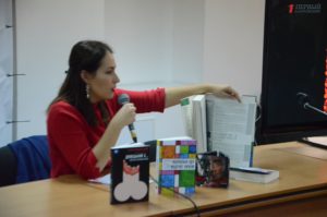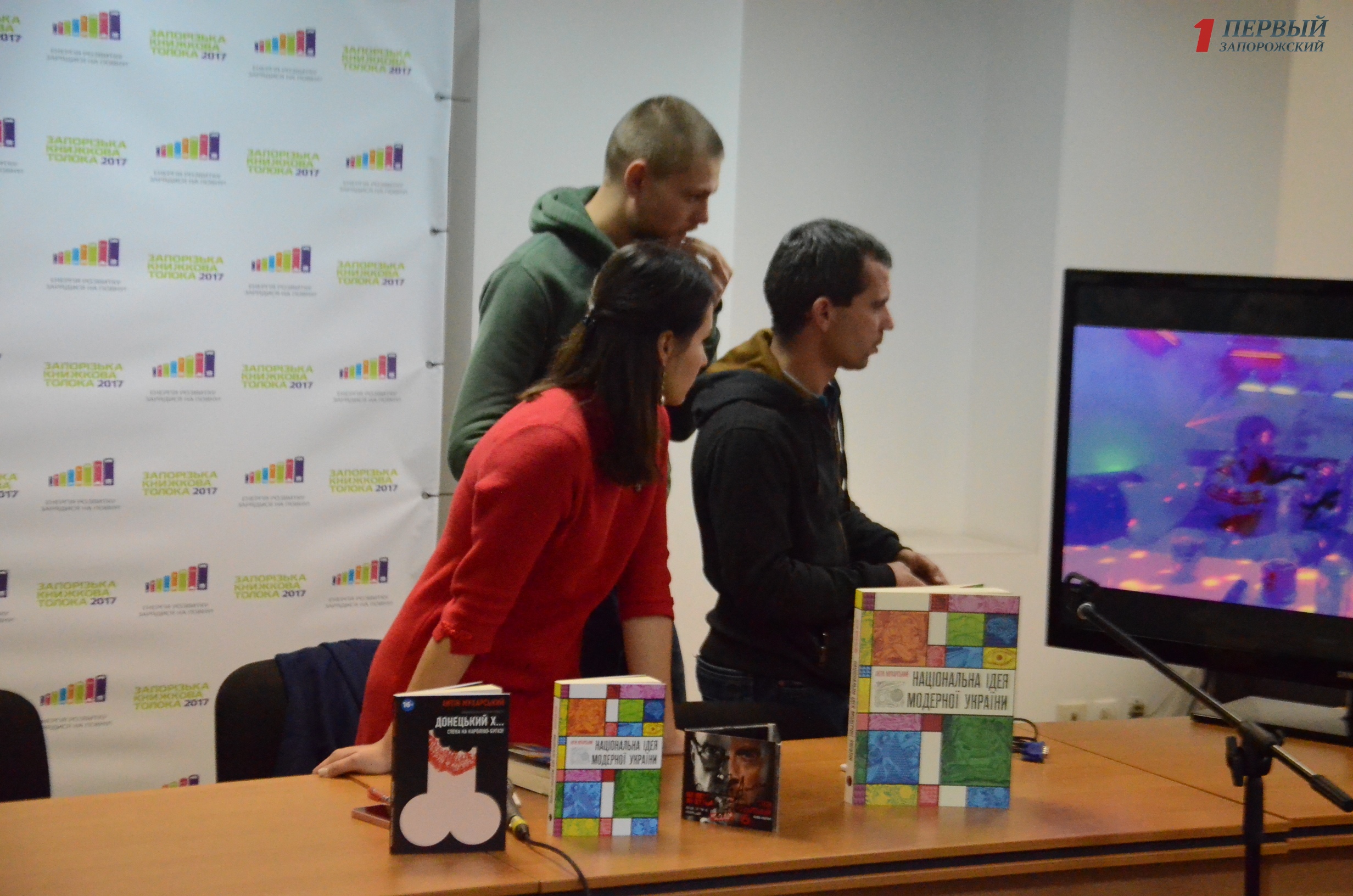 Во время презентации жена писателя показала аудитории клип на песню Ореста Лютого (псевдоним Антона Мухарского) «Росіян в Донбасе нет», который подтверждает российскую агрессию на востоке Украины. Певец посвятил песню батальону «Днепр-1».
