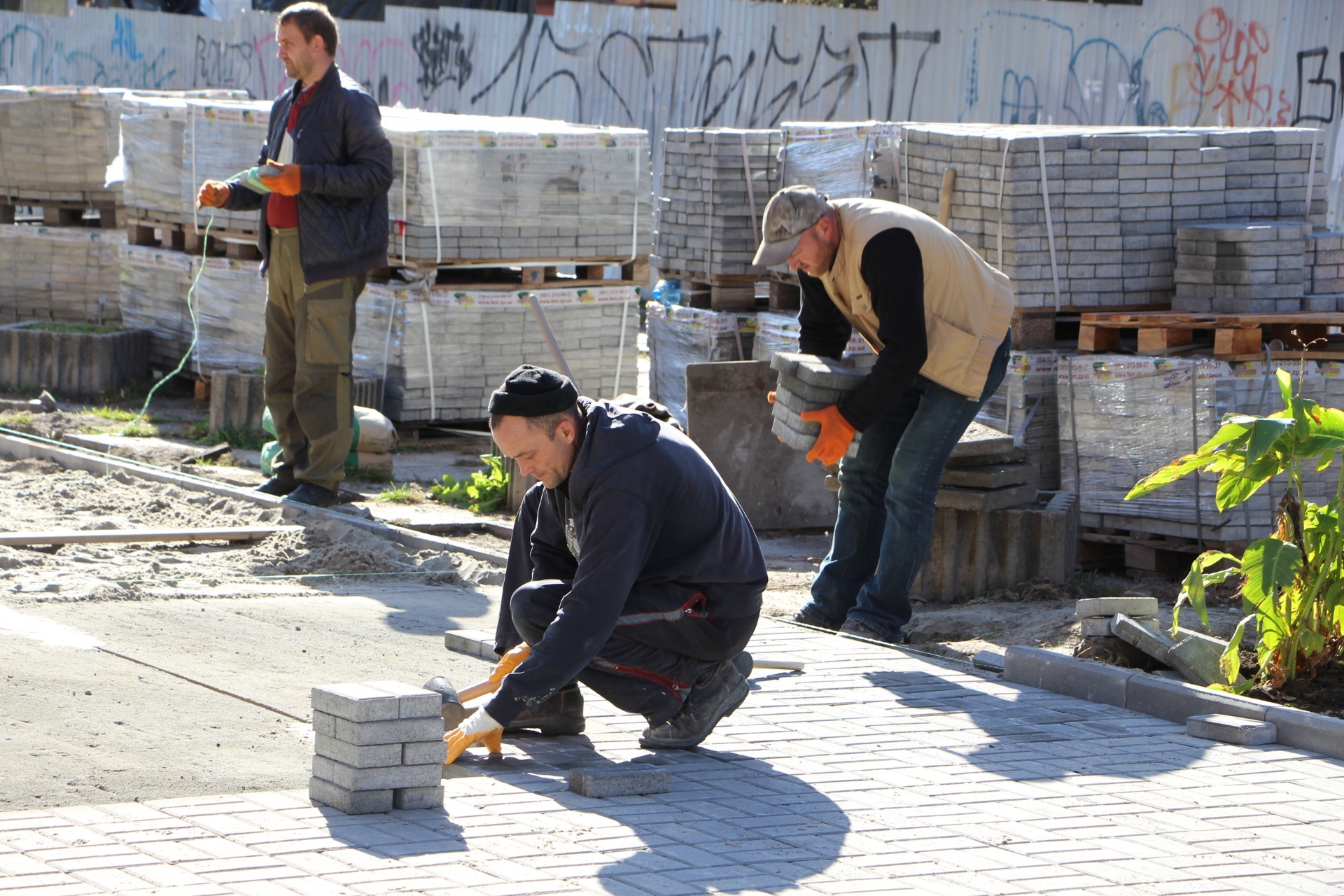 На данном участке субподрядчик КП «ЭЛУАД» выполняет работы по замене тротуарного покрытия – обновляется плитка 50×50, которая полностью была разрушена. Объем работ составляет порядка 600 м2.