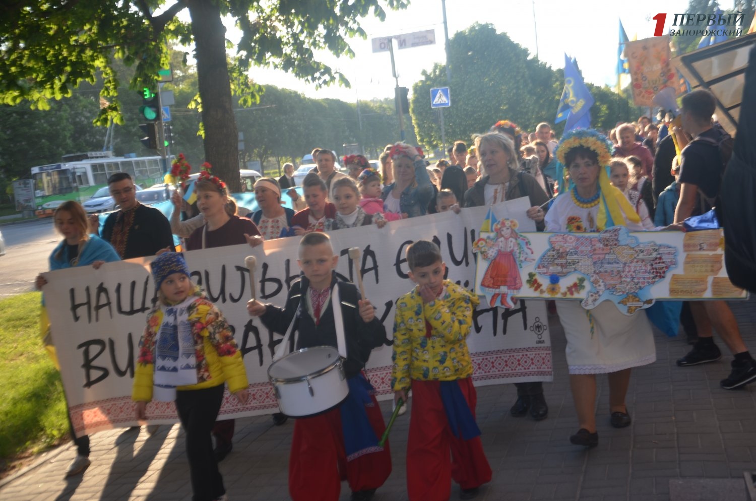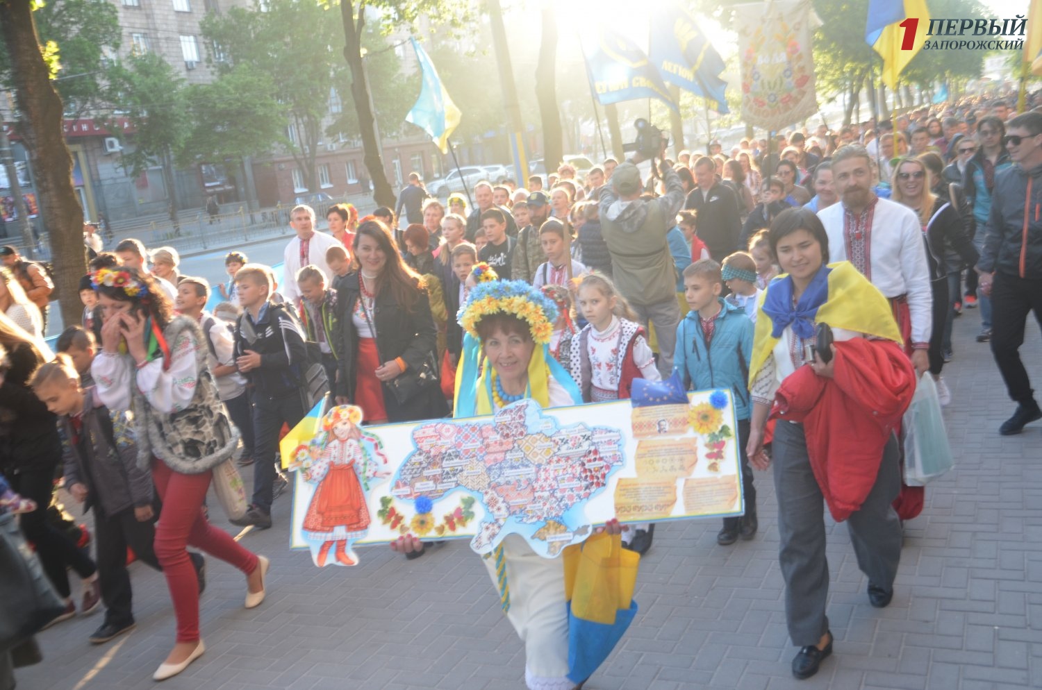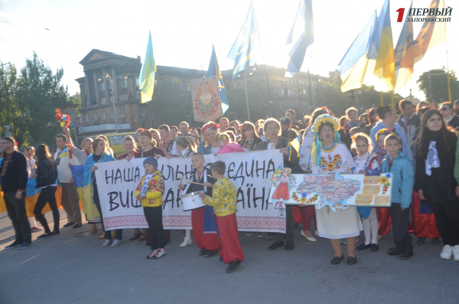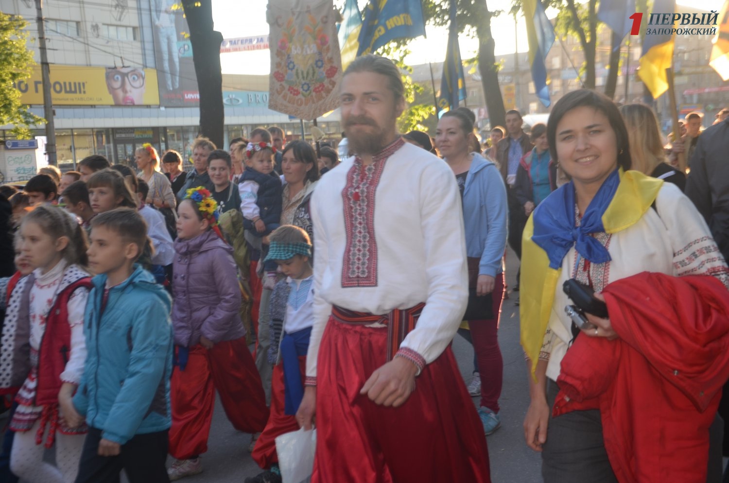 Торжественное шествие началось около Запорожского городского совета. После колонна двинулась по направлению к Запорожской облгосадминистрации. Участники скандировали «Слава Украине», «Україна єдина».