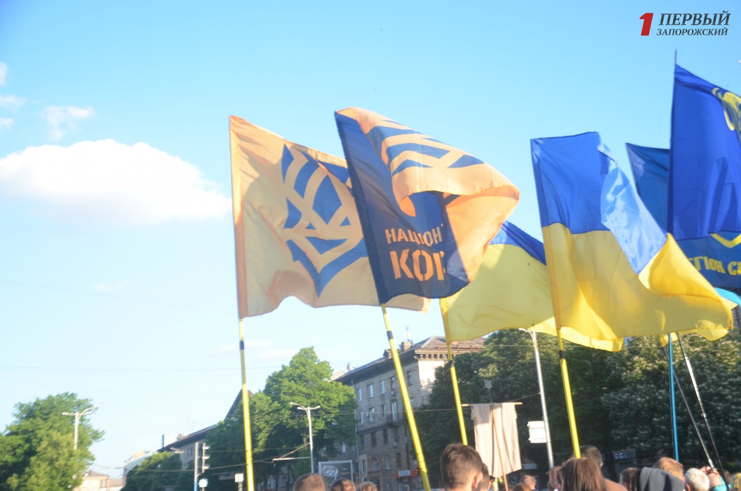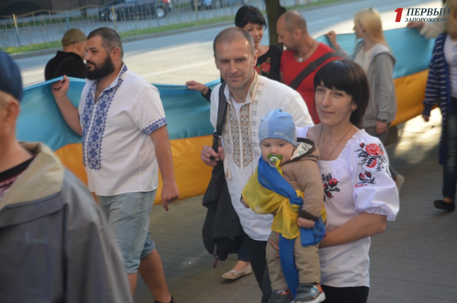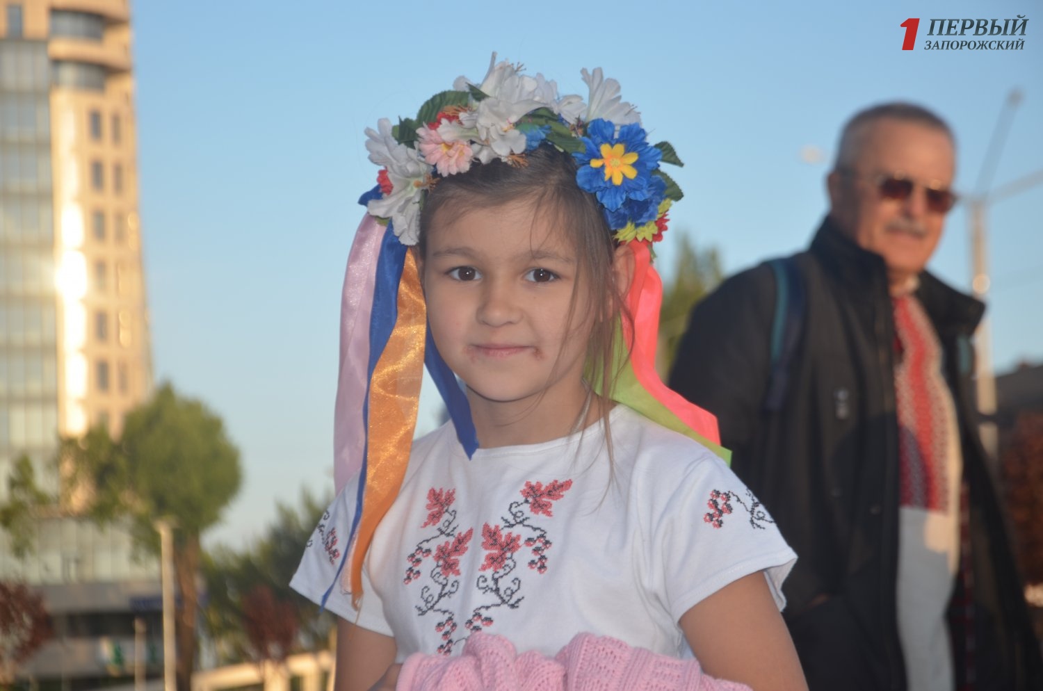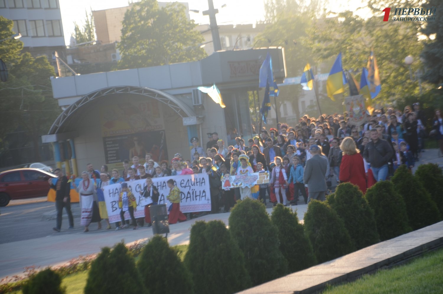 Торжественное шествие началось около Запорожского городского совета. После колонна двинулась по направлению к Запорожской облгосадминистрации. Участники скандировали «Слава Украине», «Україна єдина».